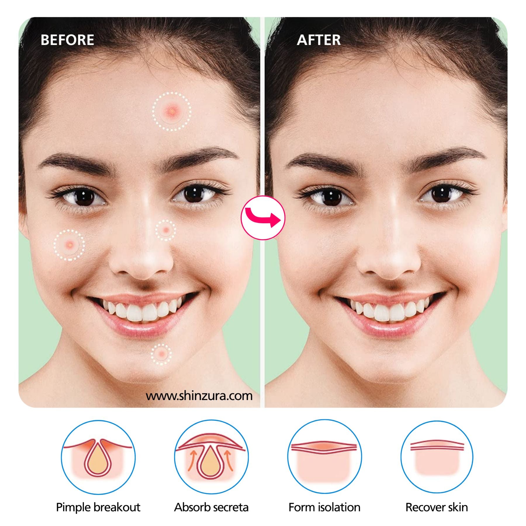 - FAST PIMPLE HEALING: Powered by 0.5% Salicylic Acid, Shinzura Acne Pimple Patches work deep within the pores to unclog impurities and reduce inflammation, helping pimples shrink faster. The hydrocolloid layer absorbs excess oil and pus, while protecting the skin to support faster recovery. Customers love the visible improvement in skin clarity and the confidence boost that comes with smoother, clearer skin.